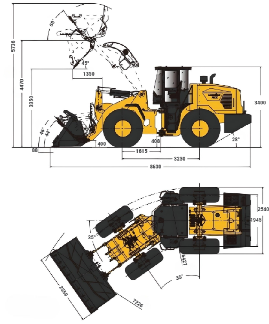 Общие параметры Масса, кг 16500 Высота выгрузки (по кромке ковша/по шарниру), мм 3350/4470 Ширина ковша, мм 2550 Объем ковша, м3 3 Номинальная грузоподъемность, кг 5000 Тяговое усилие, кН 150±3 Вырывное усилие, кН 170 Преодолеваемый подъем, град. 28 Д х Ш х В, мм 8630×2550×3400 Двигатель Модель Weichai WD10G198E212 Мощность двигателя, кВт при об/мин 146/2200 Номинальный крутящий момент,Нм 950/150-1700 об/мин Диаметр x ход поршня, мм 126x130 Количество цилиндров 6/9,726L Очиститель воздуха Воздухоочиститель Трехступенчатый Генератор переменного тока, А 70 Аккумулятор 2-24 В/120 Ач Пусковой мотор 24 В/7,5 кВт Трансмиссия Тип трансмиссии Планетарная с переключением мощности Тип переключения передач Механический с переключением мощности Давление в трансмиссии, МПа 1,1-1,5 Тип гидротрансформатора Одноступенчатый, двухтурбинный, 4-элементный Оси Жесткие (спереди) и качающиеся (сзади) Отклонение задней оси, град. ±10° Дифференциальный Условный Главный редуктор Спиральный скос, 1-ступенчатый редуктор Конечный редуктор Планетарная редукция Шина 23.5-25 L-3 16PR TT Скорость движения вперед 12/37 км/ч Скорость движения назад 16 км/ч Тормозная система Тип рабочего тормоза Полностью гидравлический тормоз Давление, Мпа 12 Стояночный тормоз Регулируется гибким валом Аварийный тормоз Суппортный тормоз Система рулевого управления Тип системы Гидравлическая система измерения нагрузки Насос 212 л/мин / 2200 об/мин Рабочее давление системы,Мпа 16 Тип цилиндра Двойного действия Угол поворота , град ±35° Гидросистема Тип Управление однорычажным джойстиком Насос 162 л/мин / 2200 об/мин Регулирующий клапан 2 золотника Давление в системе 26 МПа Время цикла (сек) ≤9,0 Электрическая система Напряжение в системе, V 24 Аккумуляторные батареи (2 последовательно), А/ч 2x80 Заправочные ёмкости Топливный бак, л 280 Гидравлический бак, л 240 Коленчатый вал, л 17 Трансмиссия, л 48 Мосты (передний, задний), л 28/28 КОНФИГУРАЦИЯ Двигатель Weichai Трансмиссия LONKING Механическое переключение передач Оси LONKING (сухого типа) Управление с помощью джойстика (однорычажное) Полностью гидравлический рабочий тормоз Кабина ROPS&FOPS ЖК-панель приборов Кондиционер ОПЦИОНАЛЬНО Воздушный фильтр в масляной ванне Радиальные шины Ограниченное положение подъема 3-я катушка для вспомогательной функции Раздвижное окно кабины Заднее стекло с электрическим обогревом Запирающаяся крышка масляного бака Камера заднего вида Кондиционер Радио/MP3-плеер Ковш (Режущие кромки из 3 частей) Ковш для породы (2,7 м3) Ковш увеличенного размера (3,2 м3) Ковш увеличенного размера (3,6 м3) Ковш для угля (4,0 м3) Ковш для угля(4,2 м3) -